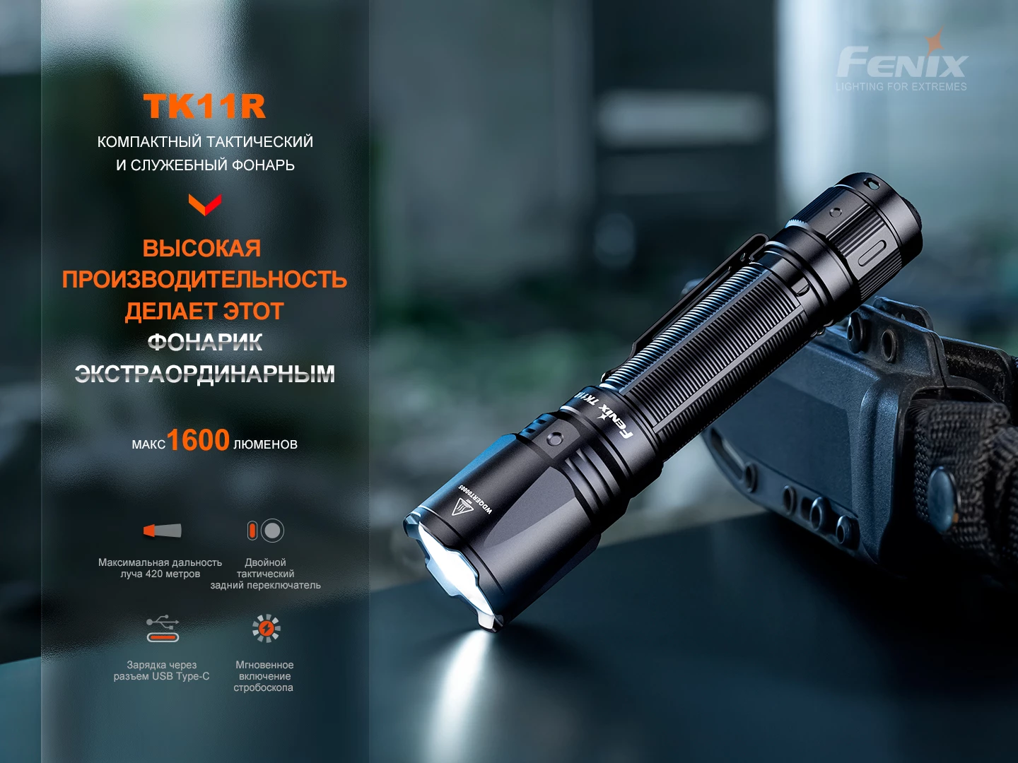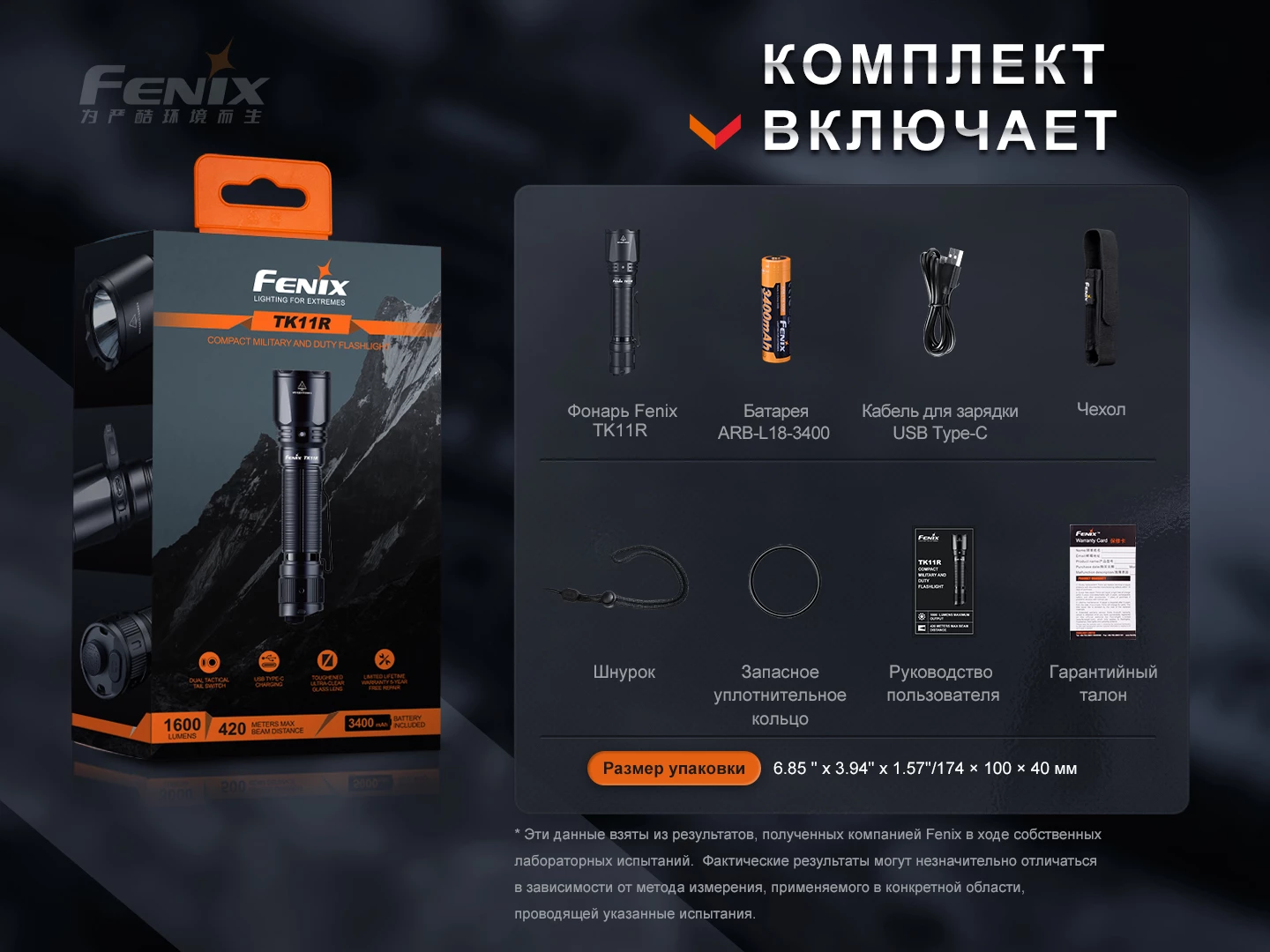 - фонарь Fenix TK11R - фирменный аккумулятор Fenix 3400 мАч - зарядный кабель USB Type-C - съемная клипса - темляк - чехол - запасное уплотнительное кольцо - инструкция О моделиСозданный для тактических целей, фонарь Fenix TK11R может работать в 4-х режимах, включая режим Высокий яркостью 1600 люмен и мигающий стробоскоп. Благодаря двум хвостовым кнопкам можно быстро переключаться между режимами одной рукой. Li-ion аккумулятор 18650 емкостью 3400 мАч питает фонарь в течение 25.5 часов и заряжается через порт USB Type-C. Алюминиевый корпус (A6061-T6) с многочисленными теплоотводящими ребрами не боится падений с метровой высоты. Его вес равен 117.5 г.