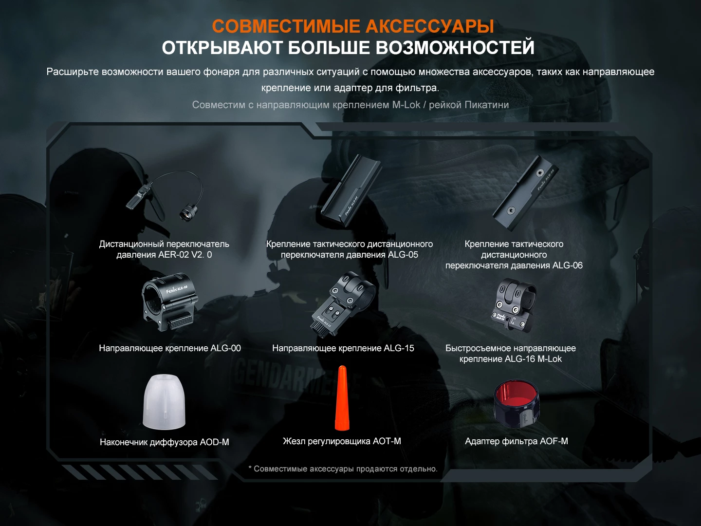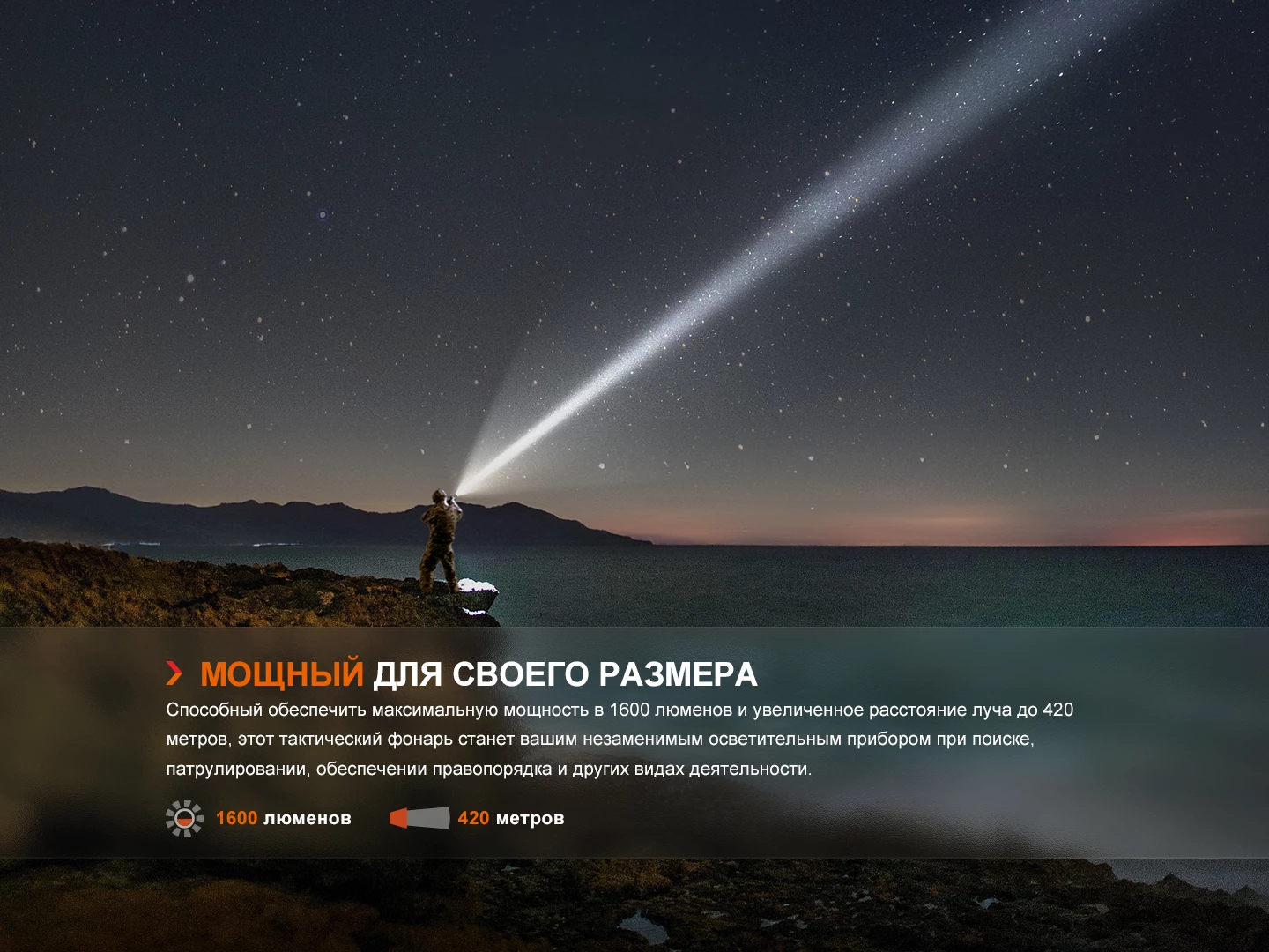 Описание фонаря Fenix TK11R:Ручной фонарь Fenix TK11R оснащен светодиодом Luminus SFT40 (холодный белый), который генерирует узкий и дальнобойный световой луч, чему также способствует гладкий рефлектор. Модель разработана для использования в тактических целях, а также для работников служб экстренного реагирования, нуждающихся в портативном и долговечном источнике освещения для успешного выполнения поставленных задач. Заявленный производителем срок службы светодиода достигает 50 тысяч часов, эквивалентных более чем 5.5 годам. Одно из достоинств фонаря — наличие инновационной системы передачи импульсно-частотных сигналов (APF), разработанной инженерами бренда Fenix, что позволяет увеличить максимальное значение яркости света до 1600 люмен в режиме Высокий и дистанцию освещения до 420 метров. Возможности фонаря можно расширить с помощью дополнительных аксессуаров: выносной кнопки AER-02 V2.0, креплений ALG-00, ALG-05, ALG-06, ALG-15, ALG-16, а также за счет фирменных светофильтров AOF-M, AOD-M или сигнального жезла AOT-M (перечисленные аксессуары не входят в основной комплект и покупаются отдельно). Режимы работыВ интерфейсе Fenix TK11R собраны только самые необходимые режимы мощностью от 30 люмен. Особняком находится режим стробоскоп, в котором генерируются быстрые вспышки, подходящие для дезориентации противника или подачи световых сигналов в экстренной ситуации.
