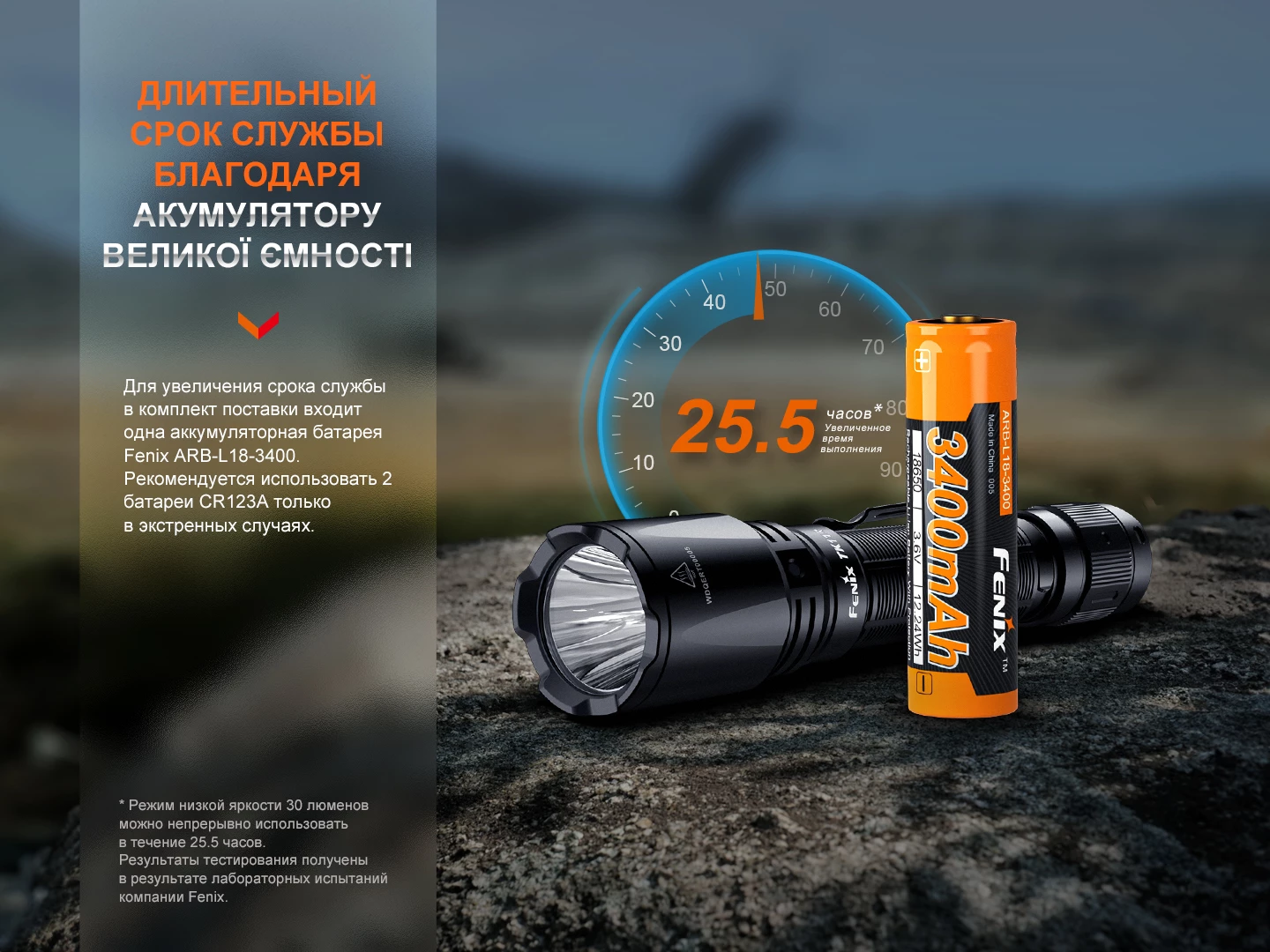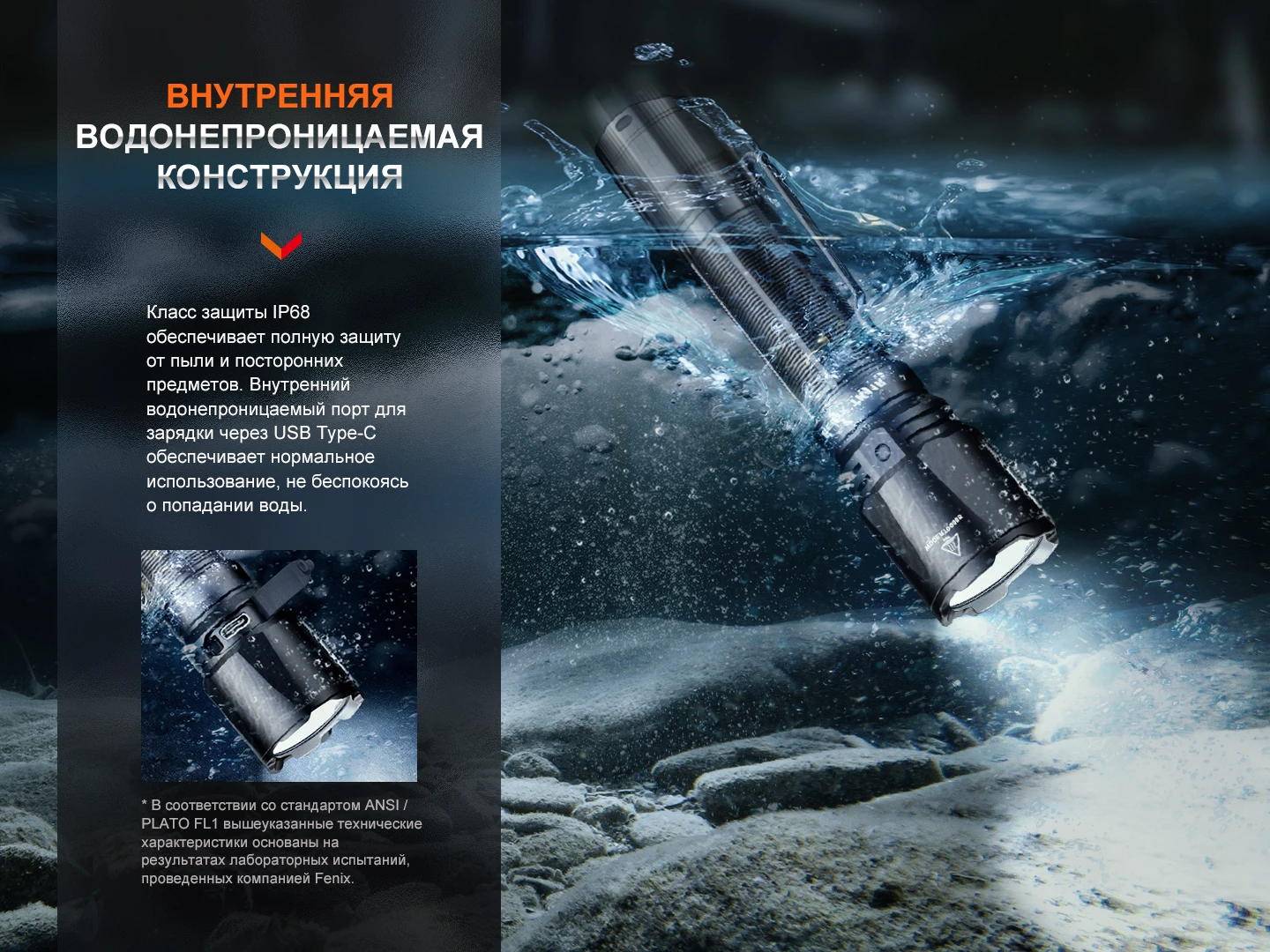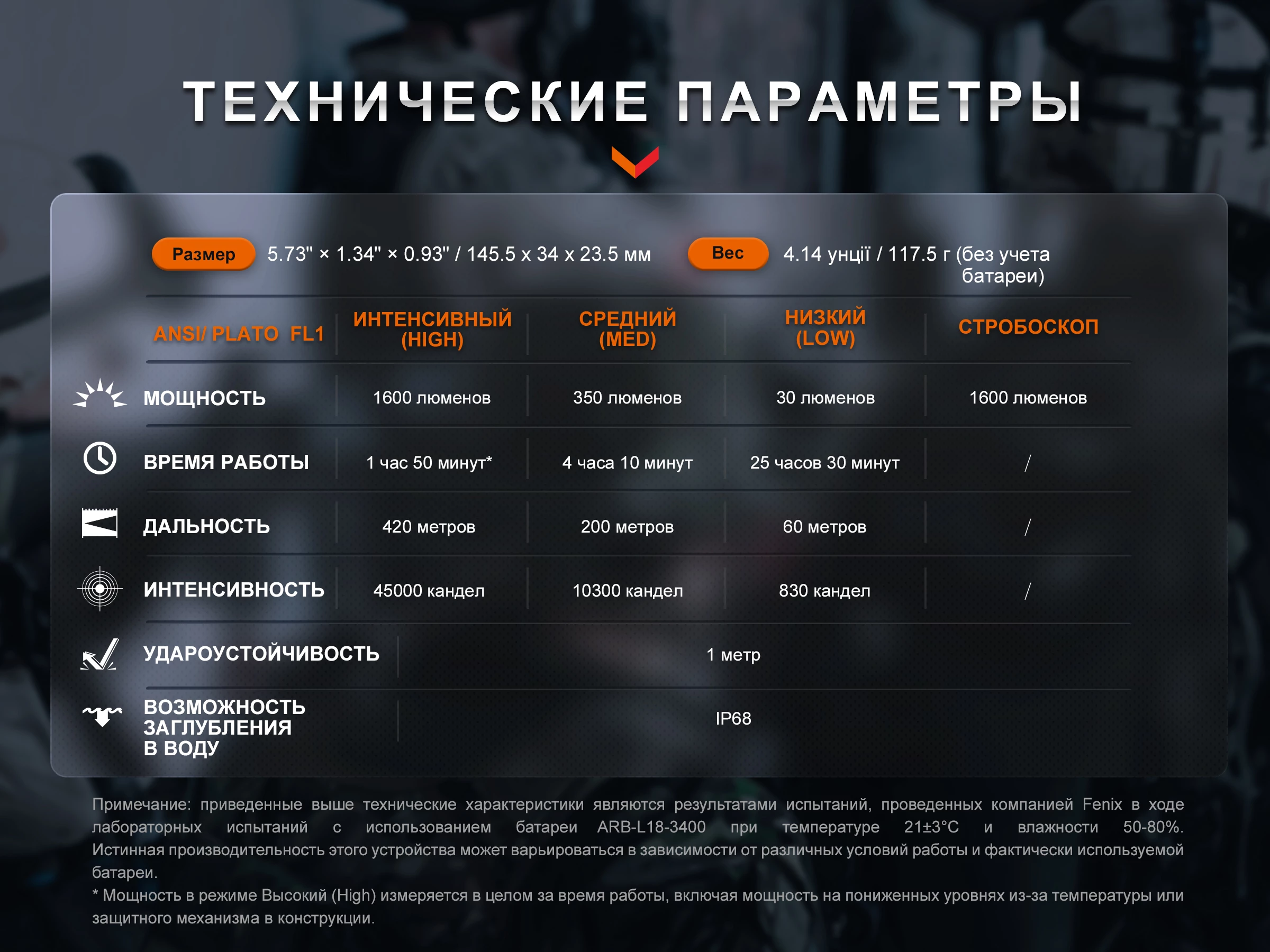 Рабочее напряжение фонаря находится в пределах от 3.0 В до 8.4 В. В момент падения напряжения в элементе питания ниже удовлетворительного уровня система автоматически понижает яркость света, пока не будет достигнута наименьшая выходная мощность. Когда это происходит, световой индикатор начинает мигать красным как напоминание о необходимости подзарядки или замены источника питания. Физические параметрыИспользование анодированного алюминия A6061-T6 в качестве материала корпуса наделило фонарь эталонной прочностью, делая его неуязвимым перед механическими повреждениями, в том числе вследствие удара при падении с метровой высоты. Конструкция дополнена уплотнительным кольцом, еще одно идет в наборе как запасное. За счет этого влага не просачивается внутрь оболочки (защитный класс IP68). Глубокие ребра в голове корпуса отводят тепло, накапливающееся во время длительной работы фонаря, а ребристая накатка обеспечивает крепкий хват вне зависимости от того, удерживается ли модель голой ладонью или рукой в тактической перчатке. Длина корпуса составляет 145.5 мм, диаметр головы — 34 мм, а диаметр хвоста — 23.5 мм. Вес модели равен 117.5 г, не учитывая источник питания. КомплектацияРучной фонарь Fenix TK11R, фирменный аккумулятор (3400 мАч) + зарядный кабель USB Type-C, съемная клипса, темляк, чехол, запасное уплотнительное кольцо, гарантия, инструкция. Характеристики: