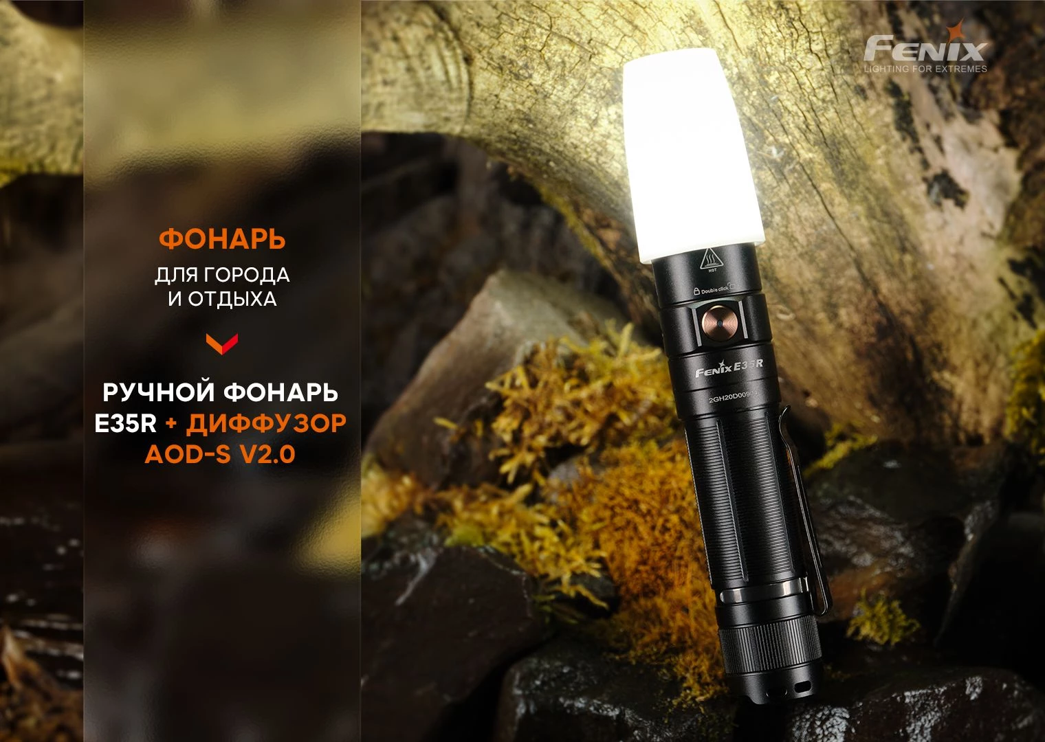 Эксклюзивно для рынка Украины бренд Fenix выпустил функциональный комплект, состоящий из фонаря Fenix E35R и диффузионного фильтра AOD-S V2.0. Сочетая данные товары, пользователь может использовать осветительное устройство в самых разных целях — от яркой подсветки дальних объектов на расстоянии 260 метров до мягкого освещения пространства вокруг, которое обеспечивает диффузор.