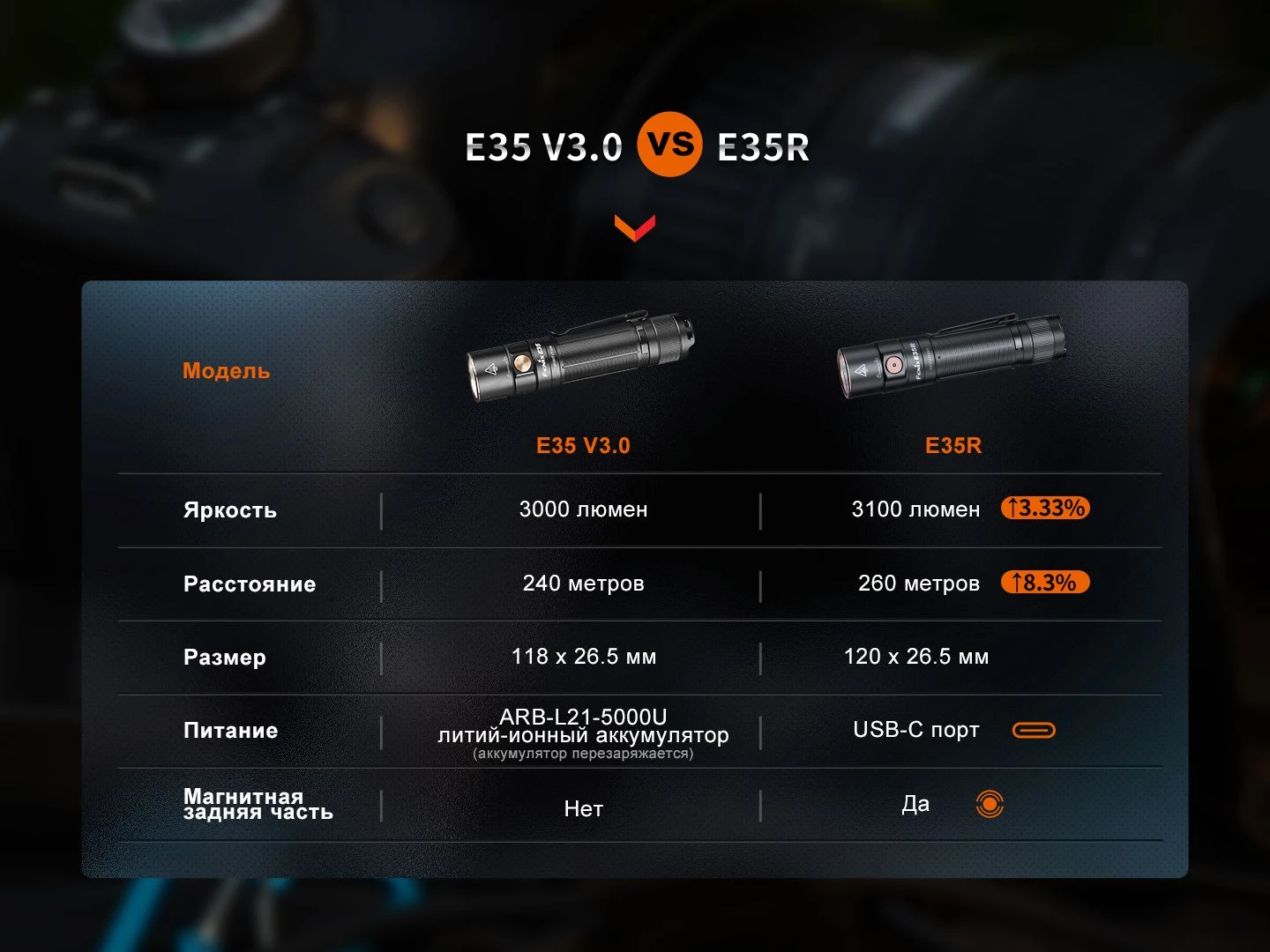 В набор входит: фонарь Fenix E35R, Li-ion аккумулятор 21700, кабель для зарядки Type-C, темляк, инструкция, диффузионный фильтр AOD-S V2.0.