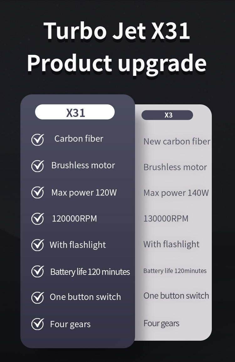 Турбовентилятор. Тривале натискання кнопки живлення дозволяє безпосередньо ввести максимальну швидкість вітру. 120000±10% об/хв. Подвійне натискання дозволяє ввійти в режим перемикання передач, а швидкість вітру – 1,2,3, а положення передачі регулюється. Легкий та портативний: Повітродувка Crossgon pocket King Kong x31 важить лише 248 грамів і її можна тримати однією рукою, що робить її дуже зручною для перенесення. Новітній налаштований безщітковий двигун потужністю 120 Вт·год генерує повітряну тягу 110 г при швидкості вітру понад 45 метрів за секунду. «Максимальна швидкість – 120000 об/хв (8 хвилин використання)» . Час роботи від батареї до 2 годин: Повітродувка CROSSGUN оснащена літій-іонним акумулятором високої щільності ємністю 2500 мАг*2 (18650), якого можна використовувати протягом 2 годин на першій передачі. Світлодіод: Встановіть світлодіодну лампу з високим світловим поглинанням у нижній частині виробу, яка може освітлювати темні сцени в межах 30 метрів після ввімкнення, а також має функцію автоматичного мигання у разі лиха SOS. Рівень швидкості: Турбовентилятор Crossgon має чотири регульовані швидкості. Натисніть і утримуйте кнопку живлення, щоб увійти в режим найвищої швидкості вітру. Подвійне клацання дозволяє перемикатися в режим вітру, зручно та швидко. Перша швидкість — 35000 об/хв, друга — 50000 об/хв, а третя — 70000 об/хв. Тривале натискання кнопки живлення на корпусі дозволяє увійти в максимальний режим 120000±10% об/хв.