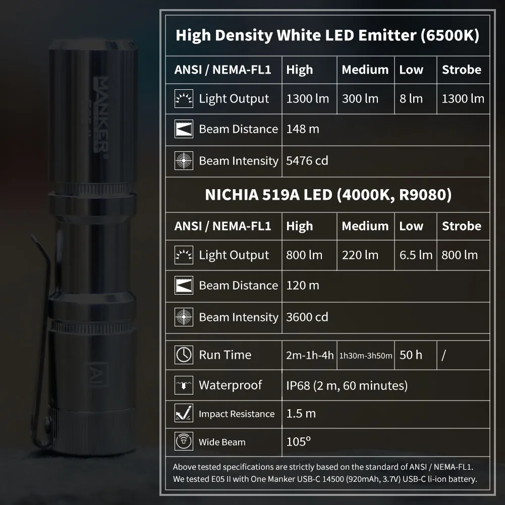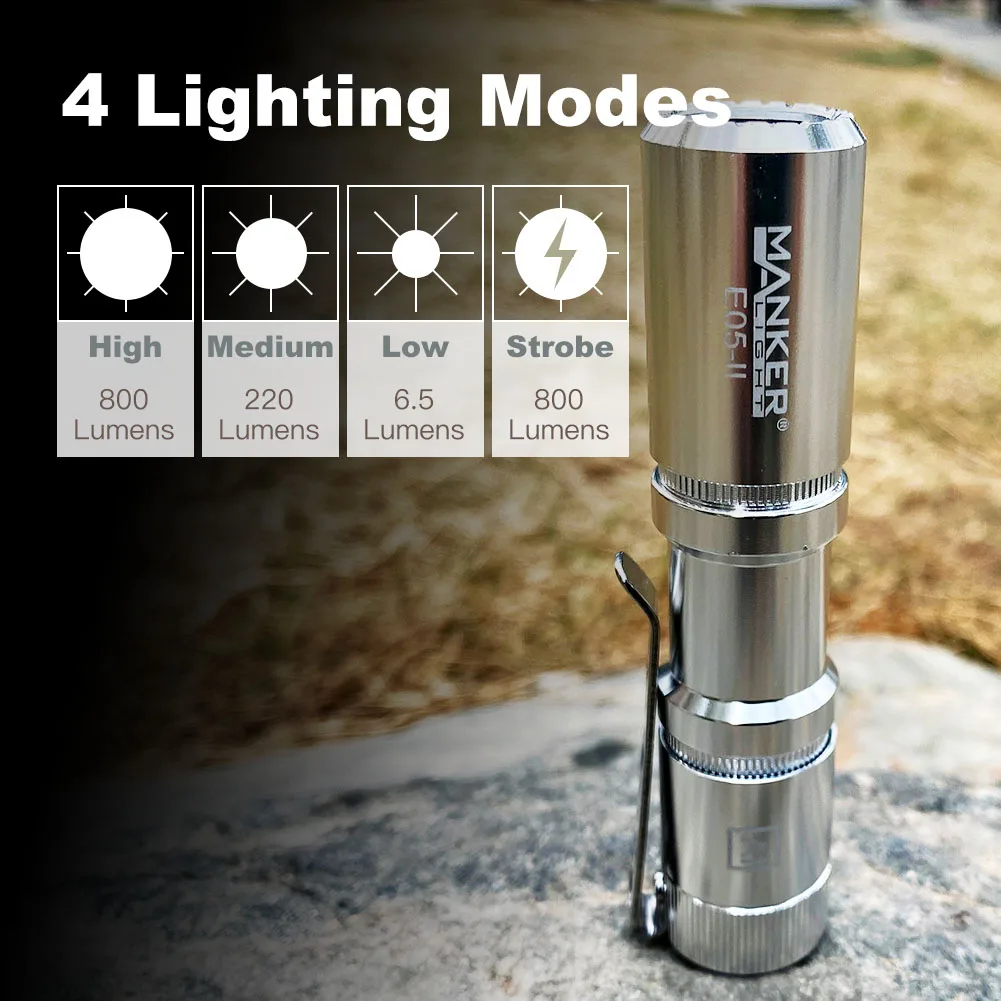 Компактний ліхтарик Manker E05 II CW діод сріблястий алюміній 1300 люмен акм 14500