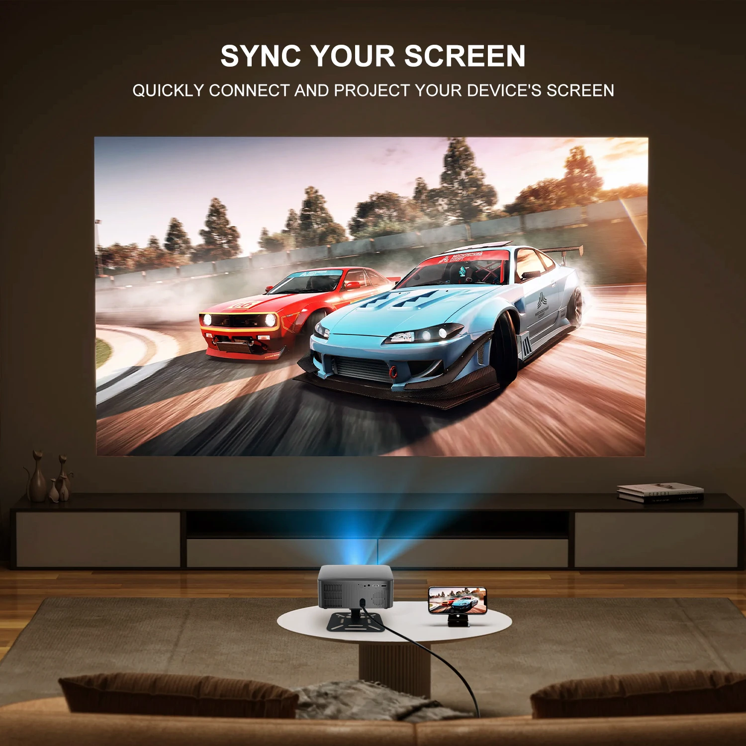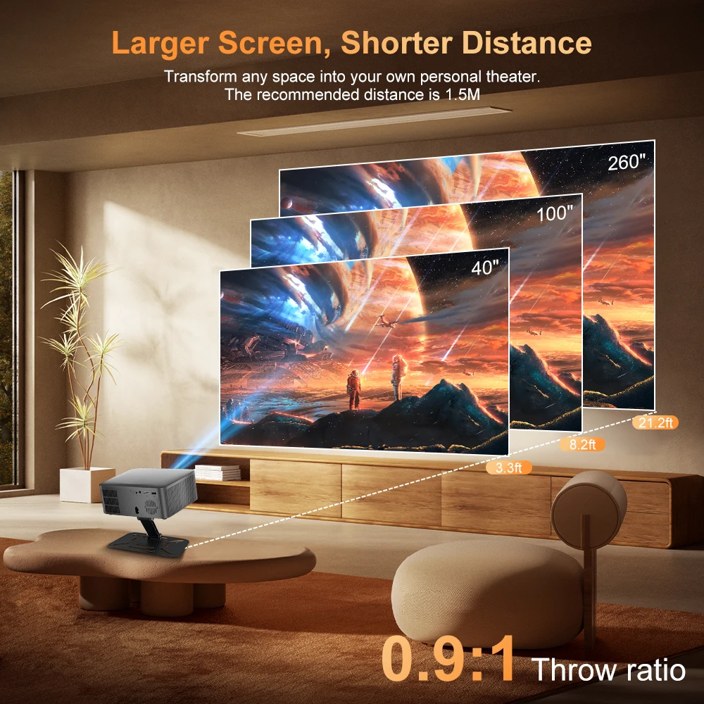• Проекційне співвідношення 0,9:1: Проекція великих екранів розміром 50–100 дюймів з невеликої відстані, ідеально підходить для невеликих спалень або компактних житлових приміщень.