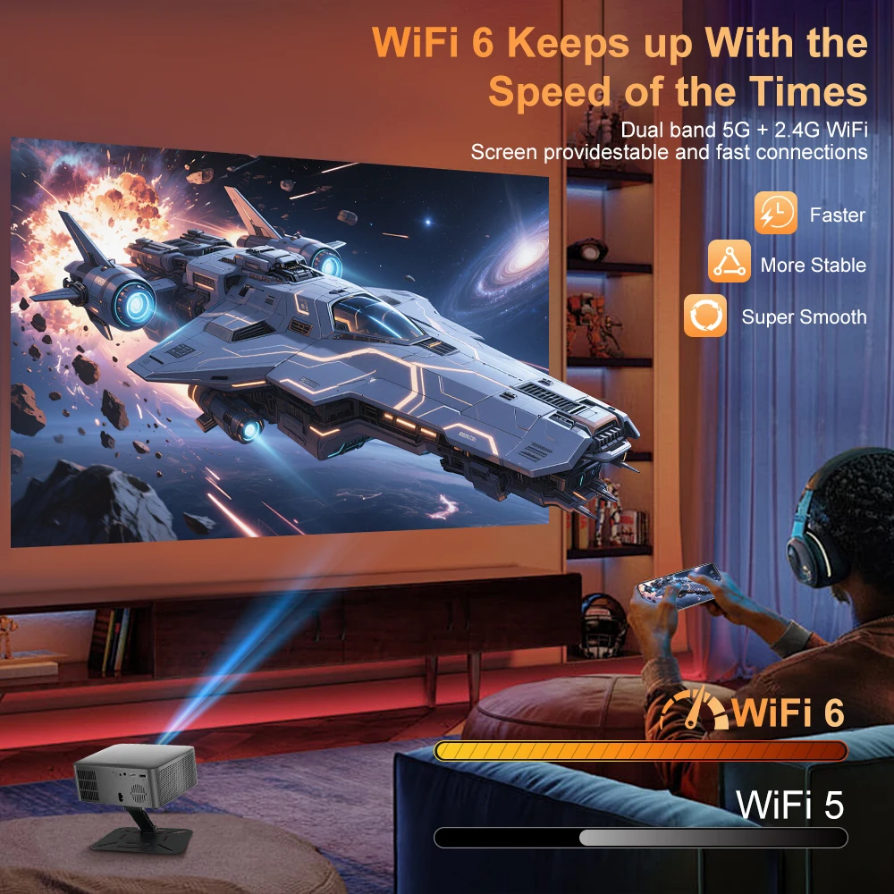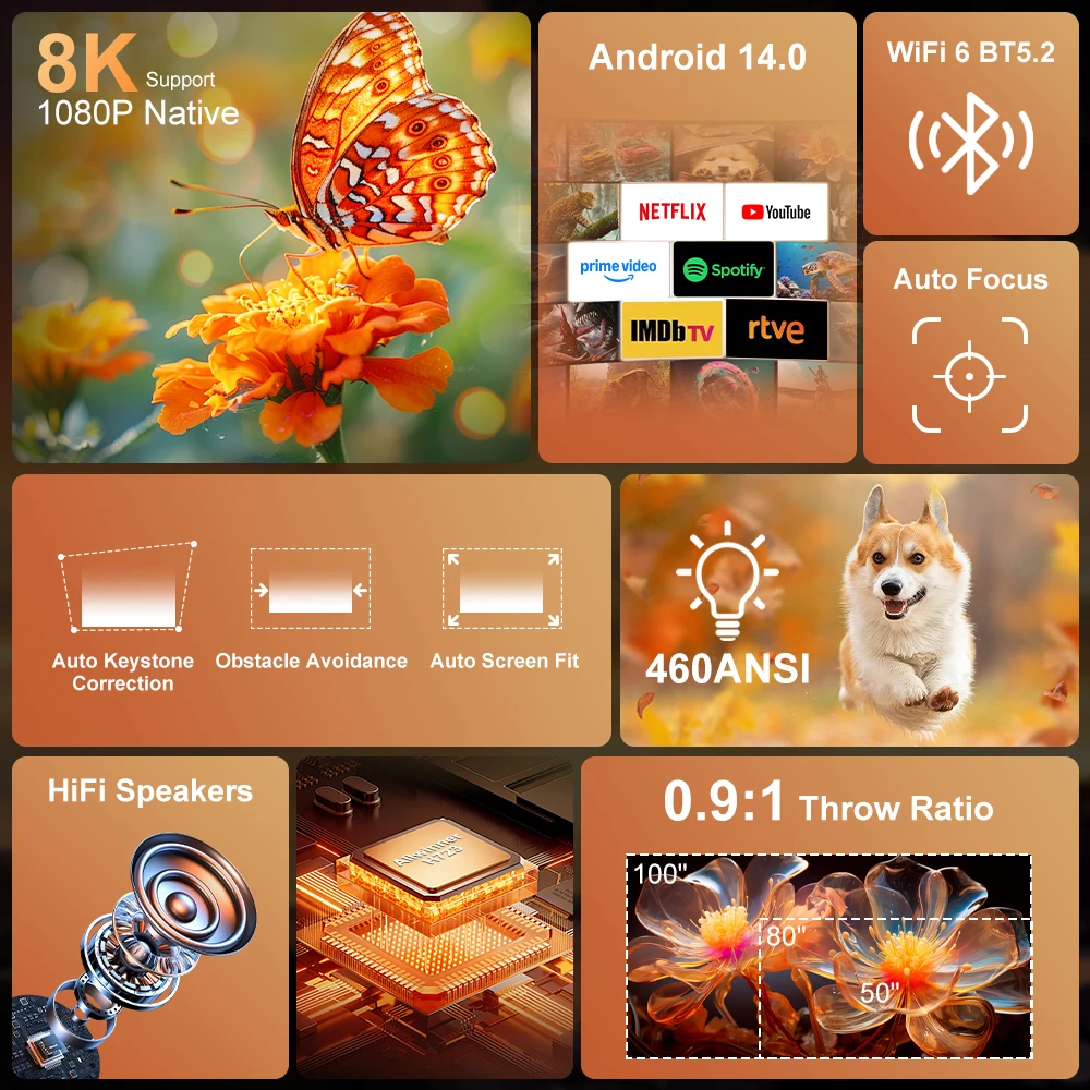 Підніміть рівень домашніх розваг на новий рівень за допомогою інтелектуального проектора SALANGE 1080P Native Smart Projector – передового пристрою, розробленого для забезпечення кінематографічного досвіду у комфорті вашого власного простору. Завдяки роздільній здатності 1080P, яскравості 460 ANSI люменів та підтримці декодування відео 8K, цей проектор забезпечує приголомшливо чітке та яскраве зображення для фільмів, ігор тощо. Працює на операційній системі Android 14.0 та оснащений Wi-Fi 6 та Bluetooth 5.2, він пропонує безперебійне підключення та доступ до світу потокового контенту.