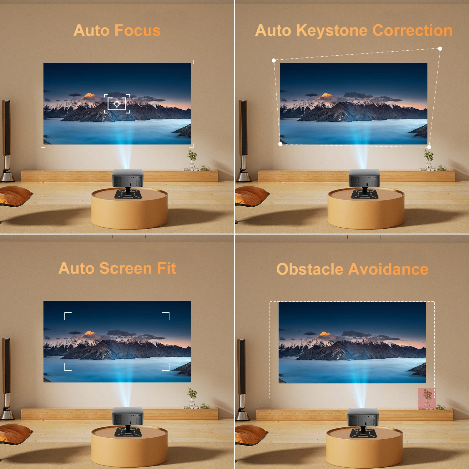 • Автоматичне припасування до розміру екрана: Автоматично визначає та підлаштовує проекцію під розмір екрана, оптимізуючи враження від перегляду.