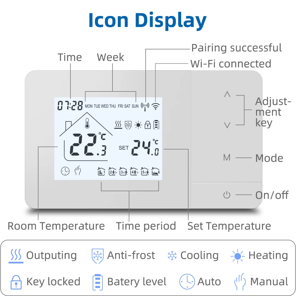 【Керування за допомогою додатків】Термостат можна підключити до додатків Tuya та Smart Life, а також дистанційно керувати ним з будь-якого місця за допомогою мобільного телефону.