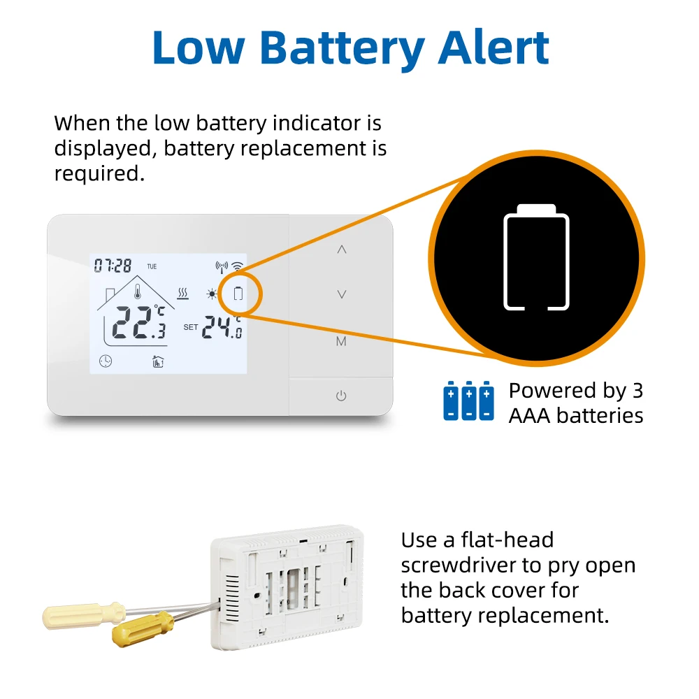 【Попередження про низький заряд батареї】Коли заряд батареї низький, термостат відобразить знак, що нагадує вам про заміну батареї.