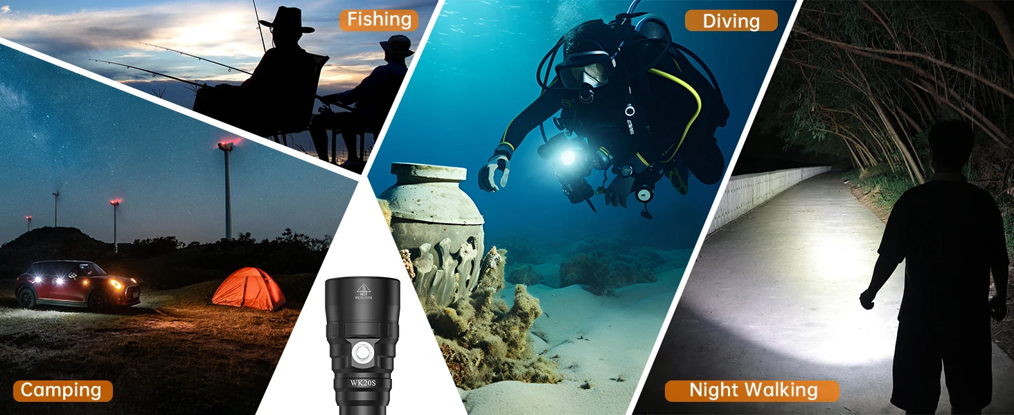 Завдяки оригінальному потужному світлодіоду, корпусу з алюмінію 6061 та рівню водонепроникності IPX8, WK20S надійно підходить для дайвінгу, пошуку, використання в надзвичайних ситуаціях тощо.